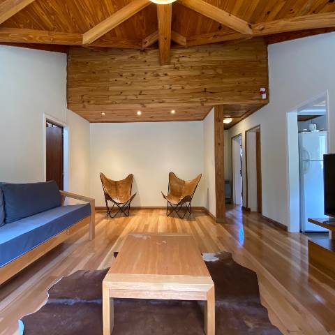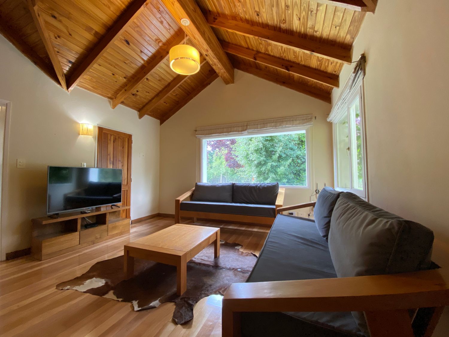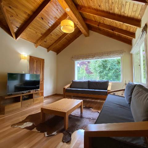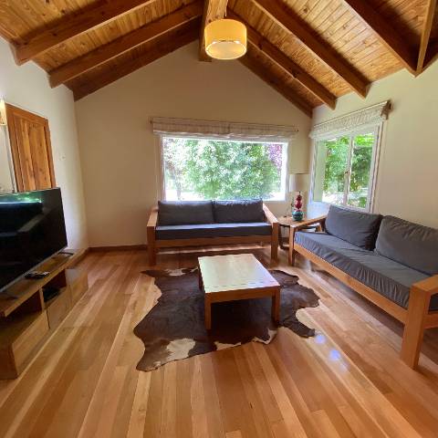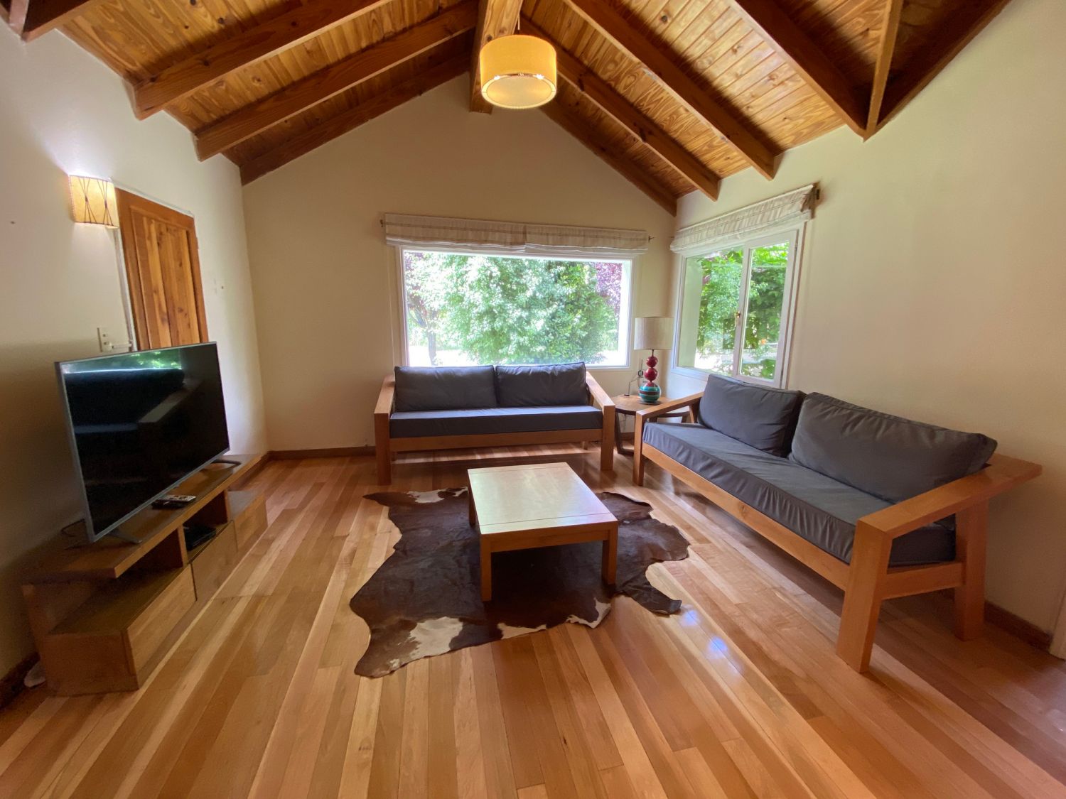 La casa cuenta con amplio Living con piso de madera de Lenga plastificado y ventanales con vistas al Cerro Chapelco; dos confortables sillones, mesa ratona de Lenga y SMART TV de 50” con DirecTv.